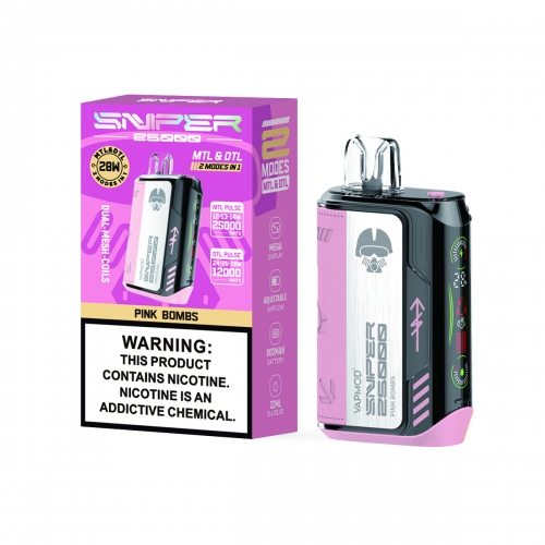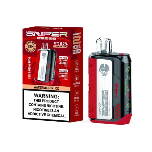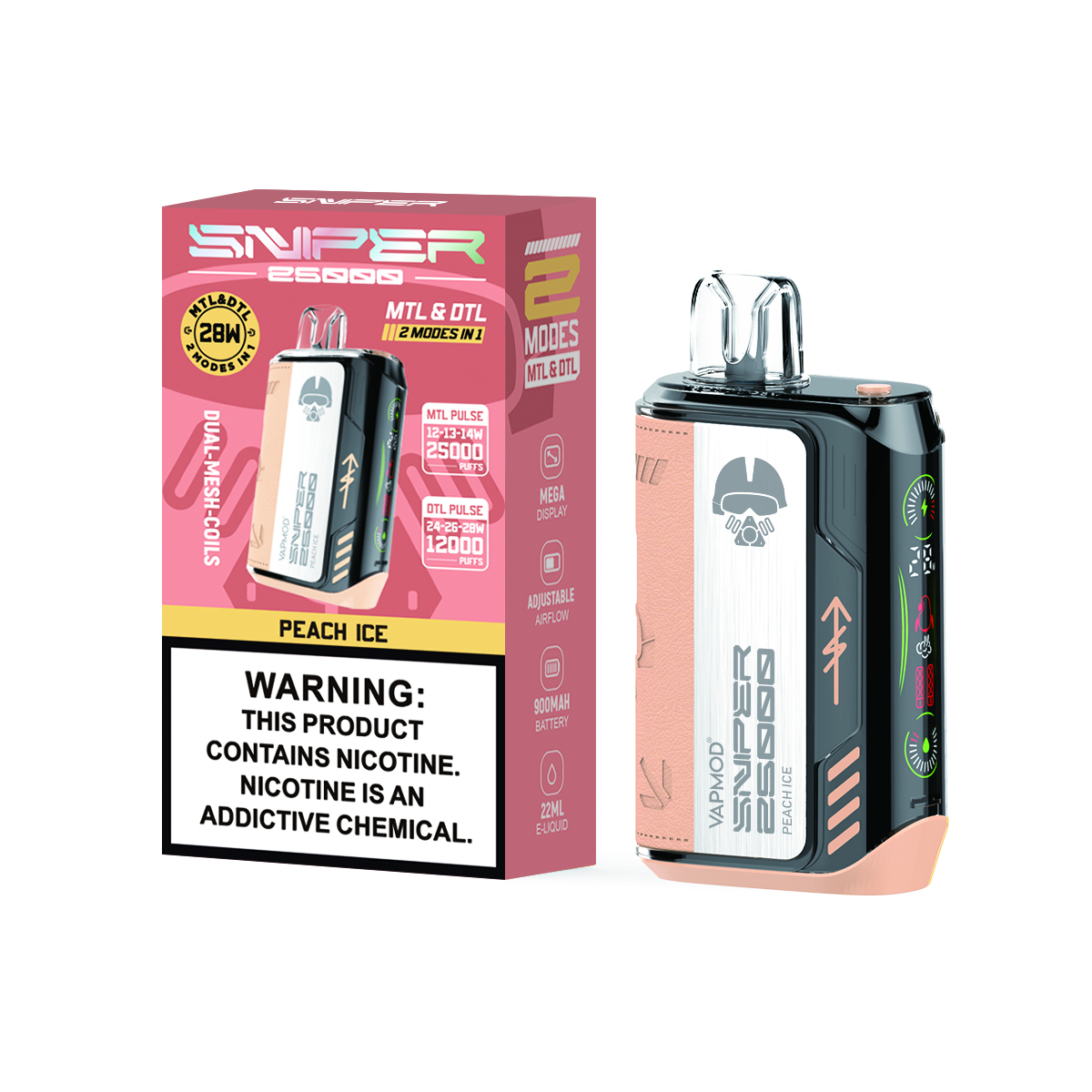 Vapmod Sniper 25000, a disposable with a massive 25,000 puffs. It features a 2 in one mode option : MTL Pulse (Mouth-to-Lung) and DTL Pulse (Direct-to-Lung) ,you can switch between two different modes to find what you like best. With its adjustable airflow for your own vaping needs , smart screen shows you battery ,watt and juice levels,powerful 900 mAh battery and 20ml e-liquid capacity offers extended vaping sessions in a compact design, perfect for on-the-go individuals seeking convenience and performance from one device.